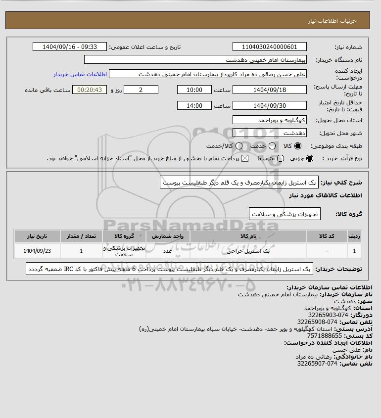 استعلام بها و موضوع استعلام استعلام پک استریل زایمان یکبارمصرف و یک قلم دیگر طبقلیست پیوست به اطلاع کلیه شرکت‌ها و افراد متخصص واجد شرایط می‌رساند، آگهی گذار در نظر دارد از طریق استعلام بها، نسبت به انتخاب و دریافت پیشنهادات اقدام نماید. این استعلام با کد آگهی ثبت شده در سامانه خبرگزاری پارس نماد : 9954943 منتشر شده است. مشخصات استعلام : تاریخ شروع استعلام: 1404/09/16 آخرین مهلت ارسال پیشنهاد قیمت : 1404/09/18 و محل اجرای پروژه : استان کهگیلویه و بویراحمد میباشد. استعلام قیمت مورد درخواست : استعلام پک استریل زایمان یکبارمصرف و یک قلم دیگر طبقلیست پیوست با دسته‌بندی‌های تخصصی و گروه های مرتبط : خدمات و تجهیزات آزمایشگاهی و پزشکی, استعلام اطلاع رسانی میگردد.