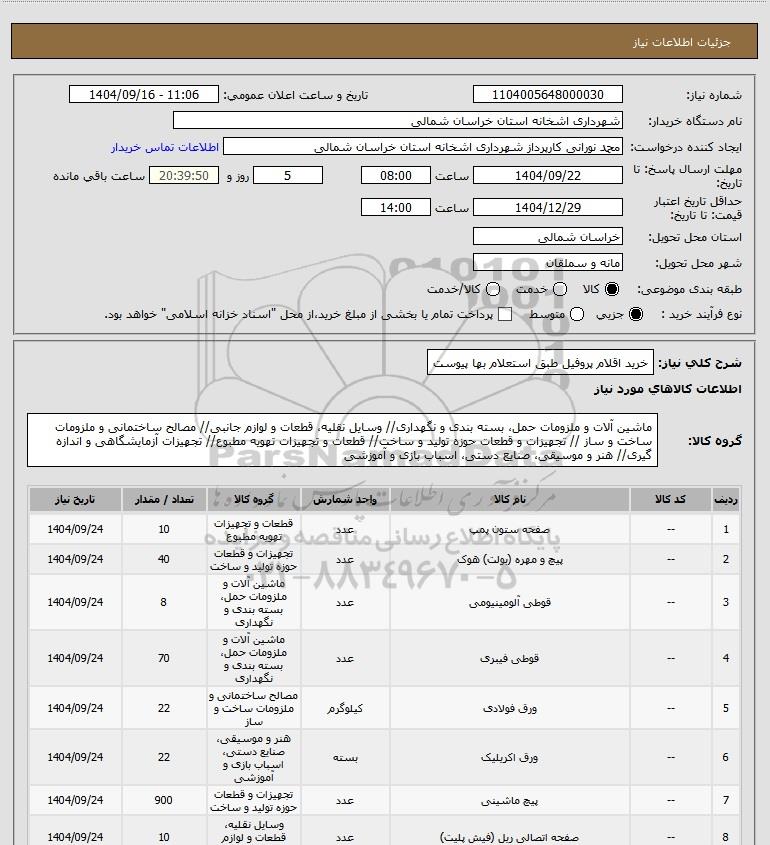 شرح کلی نیاز: خرید اقلام پروفیل طبق استعلام بها پیوست