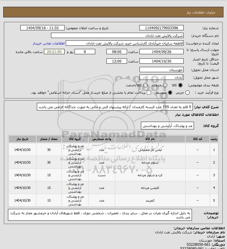 شرح کلی نیاز: 5 قلم به تعداد 105 عدد البسه کارمندان / ارائه پیشنهاد فنی و مالی به صورت جداگانه الزامی می باشد