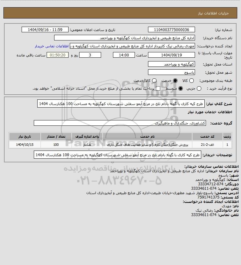 شرح کلی نیاز: طرح کپه کاری با گونه بادام تلخ در مرتع آبمو سفلی شهرستان کهگیلویه به مساحت 100 هکتارسال 1404