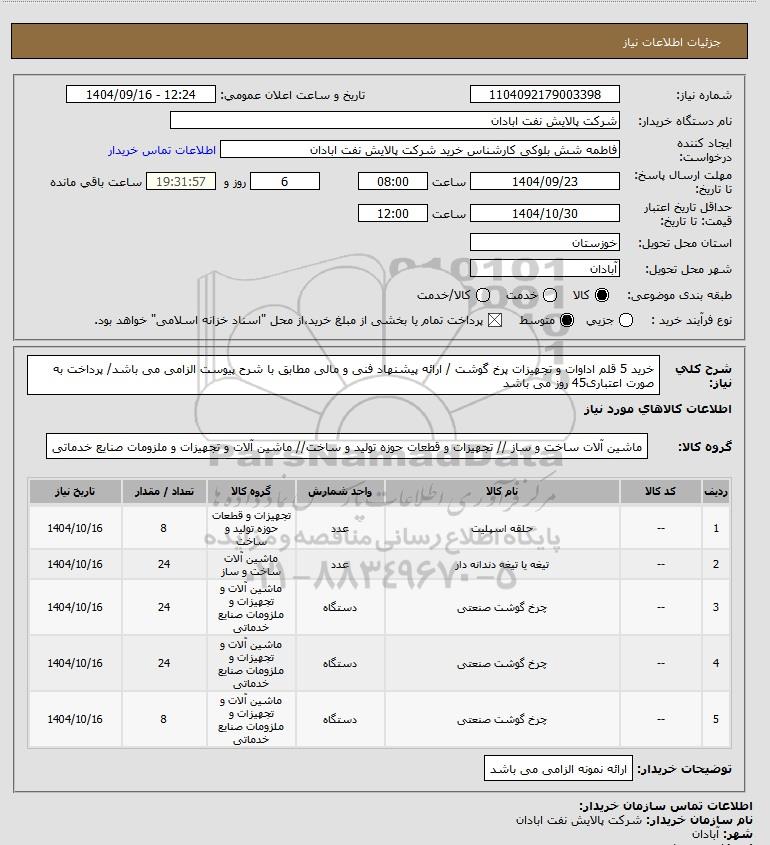 شرح کلی نیاز: خرید 5 قلم اداوات و تجهیزات پرخ گوشت / ارائه پیشنهاد فنی و مالی مطابق با شرح پیوست الزامی می باشد/ پرداخت به صورت اعتباری45 روز می باشد