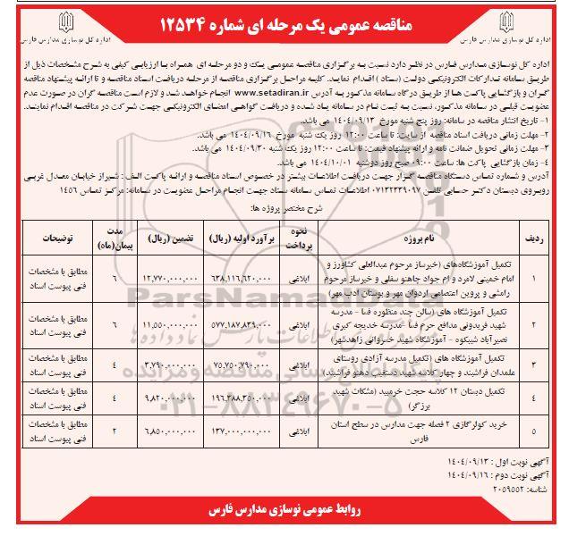 اداره کل نوسازی مدارس فارس در نظر دارد نسبت به برگزاری مناقصه عمومی یک و دو مرحله ای همراه با ارزیابی کیفی به شرح مشخصات ذیل از طریق سامانه تدارکات الکترونیکی دولت (ستاد) اقدام نماید . کلیه مراحل برگزاری مناقصه از مرحله دریافت اسناد مناقصه و تا ارائه پیشنهاد مناقصه گران و بازگشایی پاکت ها از طریق درگاه سامانه مذکور به آدرس ستاد ایران انجام خواهد شد لازم است مناقصه گران در صورت عدم عضویت قبلی در سامانه مذکور، نسبت به ثبت نام در سامانه یاد شده و دریافت گواهی امضای لکترونیکی جهت شرکت در مناقصه اقدام نمایند.