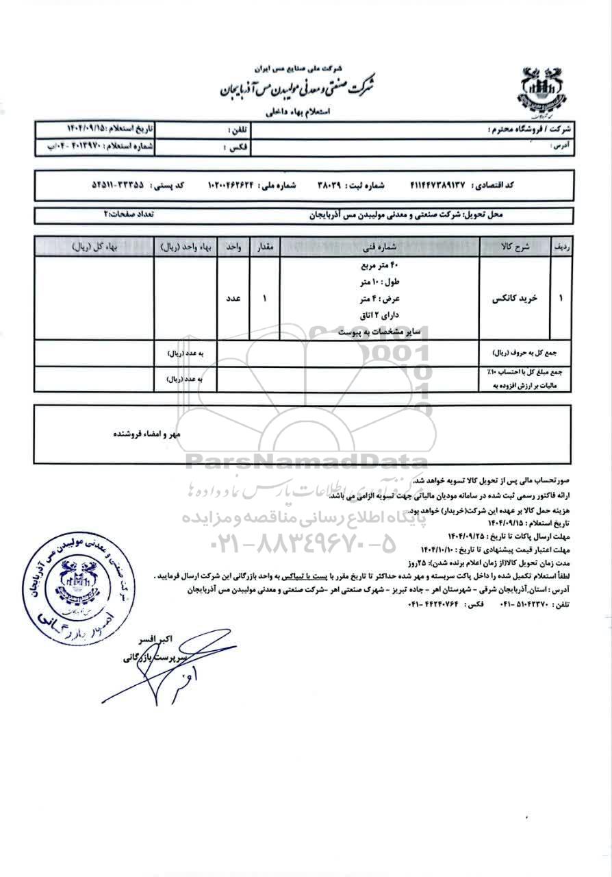 استعلام بها و موضوع استعلام استعلام خرید کانکس به اطلاع کلیه شرکتها و افراد متخصص واجد شرایط میرساند، آگهی گذار در نظر دارد از طریق استعلام بها، نسبت به انتخاب و دریافت پیشنهادات اقدام نماید. این استعلام با کد آگهی ثبت شده در سامانه خبرگزاری پارس نماد : 9956806 منتشر شده است. مشخصات استعلام : تاریخ شروع استعلام: 1404/09/16 آخرین مهلت ارسال پیشنهاد قیمت : 1404/09/25 و محل اجرای پروژه : استان آذربایجان شرقی میباشد. استعلام قیمت مورد درخواست : استعلام خرید کانکس با دستهبندیهای تخصصی و گروه های مرتبط : کانکس ، قطعات و خانه های پیش ساخته, استعلام اطلاع رسانی میگردد.