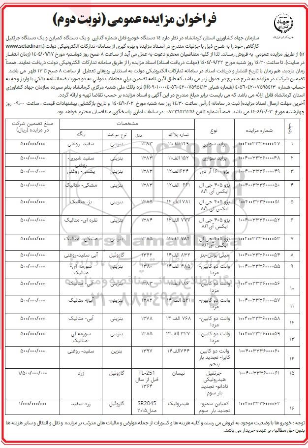 سازمان جهاد کشاورزی استان کرمانشاه در نظر دارد تعداد 14 دستگاه خودرو قابل شماره گذاری و یکدستگاه کمباین و یکدستگاه جرثقیل کارگاهی خود را به شرح ذیل با جزییات مندرج در اسناد مزایده و با بهره گیری از سامانه تدارکات الکترونیکی دولت (ستاد ایران) از طریق مزایده عمومی به فروش رساند. لذا از کلیه متقاضیان محترم دعوت به عمل می آید از ساعت 8 صبح روز دوشنبه مورخ 1404.9.17 (زمان انتشار در سایت) تا ساعت 14.30 روز شنبه مورخ 1404.9.22 (مهلت دریافت اسناد اسناد) مزایده را از طریق سامانه تدارکات الکترونیکی دولت دریافت نمایند. ضمنا زمان بازدید هم زمان با تاریخ انتشار و دریافت اسناد در سامانه تدارکات الکترونیکی دولت به استثنای روزهای تعطیل از ساعت 8 صبح تا 13 ظهر می باشد.