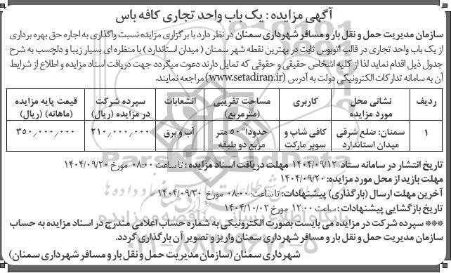 سازمان مدیریت حمل و نقل بار و مسافر شهرداری سمنان در نظر دارد با برگزاری مزایده نسبت واگذاری به اجاره حق بهره برداری از یک باب واحد تجاری در قالب اتوبوس ثابت در بهترین نقطه شهر سمنان (میدان استاندارد) با منظره ای بسیار زیبا و دلچسب به شرح جدول ذیل اقدام نماید. لذا از کلیه اشخاص حقیقی و حقوقی که تمایل دارند دعوت میگردد جهت دریافت اسناد مزایده و اطلاع از شرایط آن به سامانه تدارکات الکترونیکی دولت به آدرس سامانه تدارکات الکترونیکی دولت مراجعه نمایند.