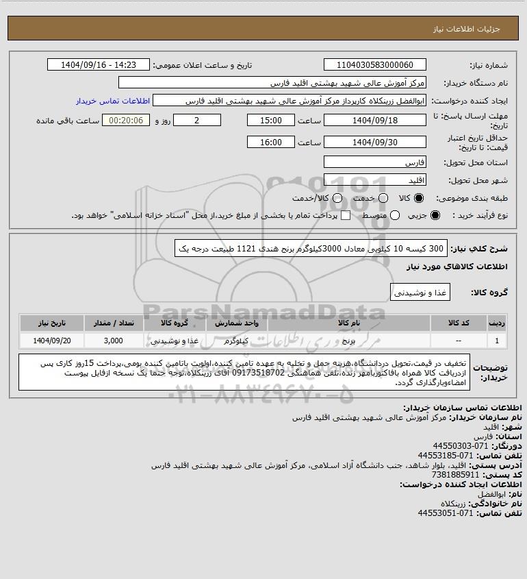 | 1 | -- | برنج | کیلوگرم | غذا و نوشیدنی | 3,000 | 1404/09/20 |