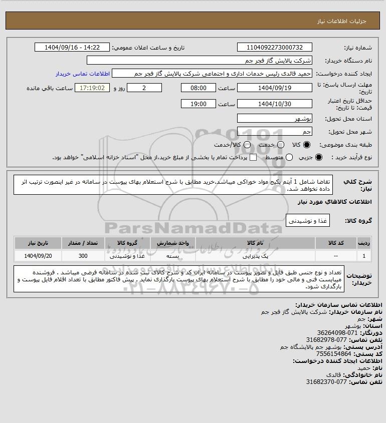شرح کلی نیاز: تقاضا شامل 1 آیتم پکیج مواد خوراکی میباشد.خرید مطابق با شرح استعلام بهای پیوست در سامانه در غیر اینصورت ترتیب اثر داده نخواهد شد.