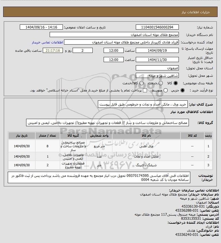 شرح کلی نیاز: خرید ورق ، مانکن امداد و نجات و خرطومی طبق فایل پیوست