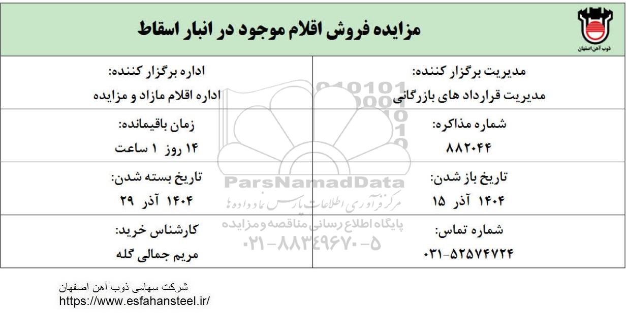 مزایده عمومی مزایده فروش اقلام موجود در انبار اسقاط برگزار میگردد. از کلیه افراد متخصص و شرکت‌های واجد شرایط دعوت به عمل می‌آید تا در این مزایده با کد خبرگزاری پارس نماد : 9958271 شرکت نمایند تاریخ شروع مزایده : 1404/09/16 مهلت شرکت در مزایده: تا پایان روز 1404/09/29 مکان برگزاری اموال واگذاری استان‌های مزایدات استان اصفهان و دسته‌بندی‌های مربوط به این حراجی متفرقه میباشد.