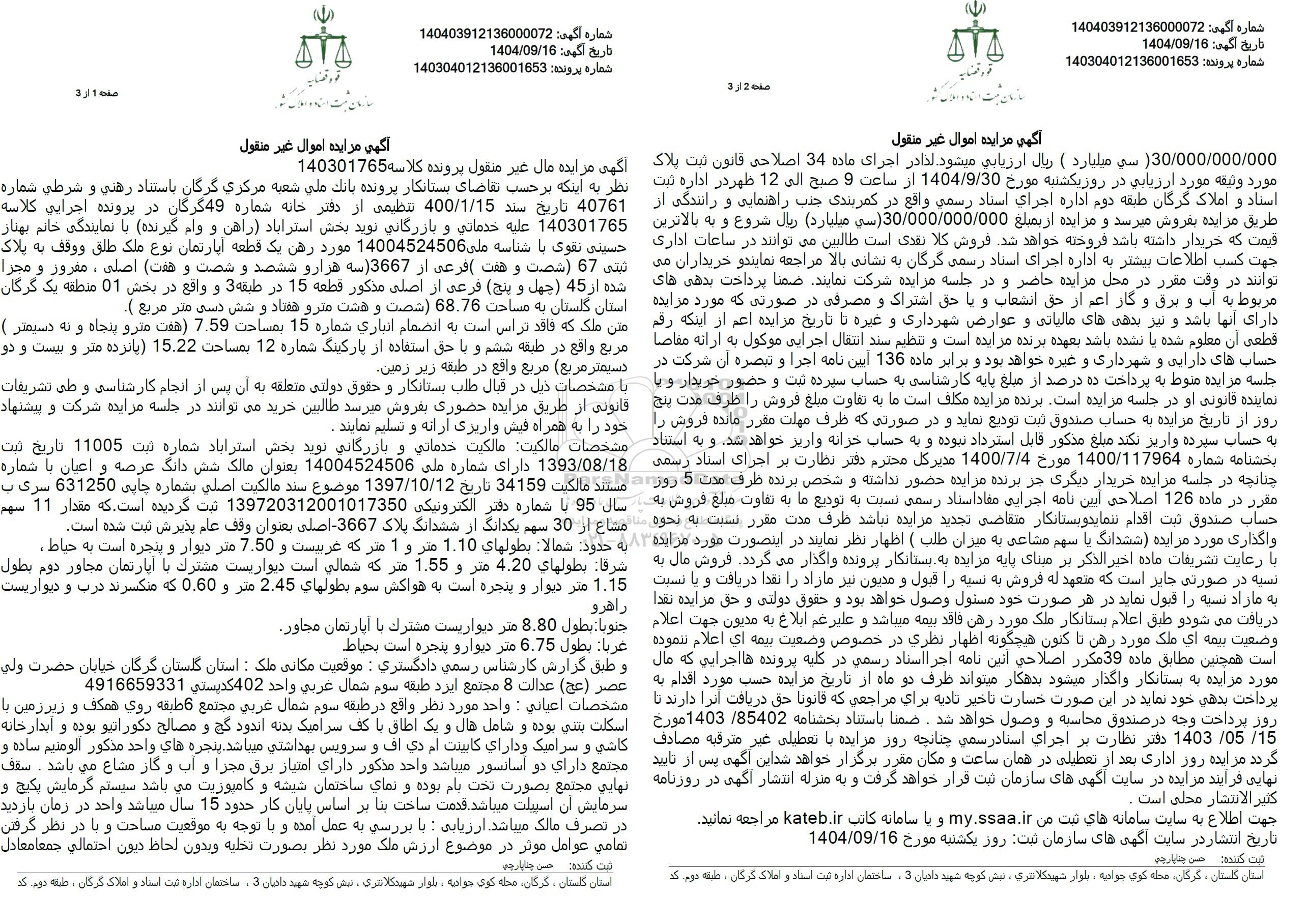 تاریخ مزایده 1404.09.30 اداره ثبت اسناد و املاک گرگان به آدرس گرگان محله کوی جوادیه، بلوار شهید کلانتری نبش کوچه شهید دادیان 3