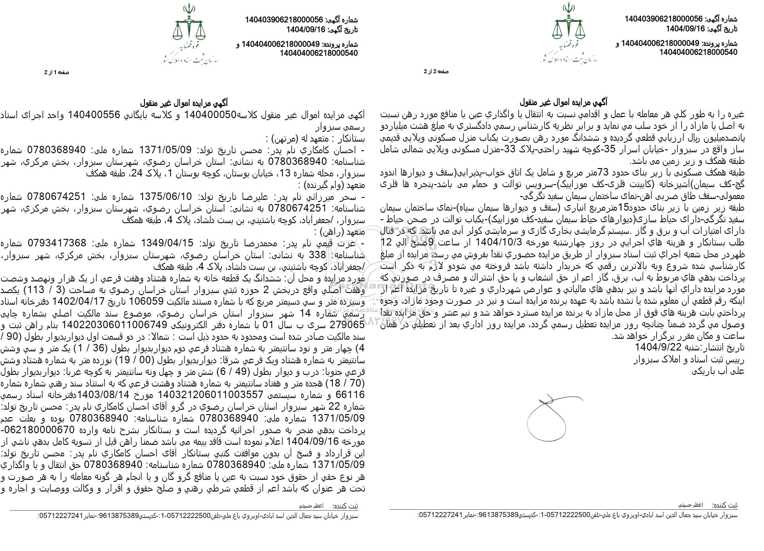 آگهی مزایده اموال غیر منقول کلاسه 140400050 و کلاسه بایگانی 140400556 واحد اجرای اسناد رسمی سبزوار