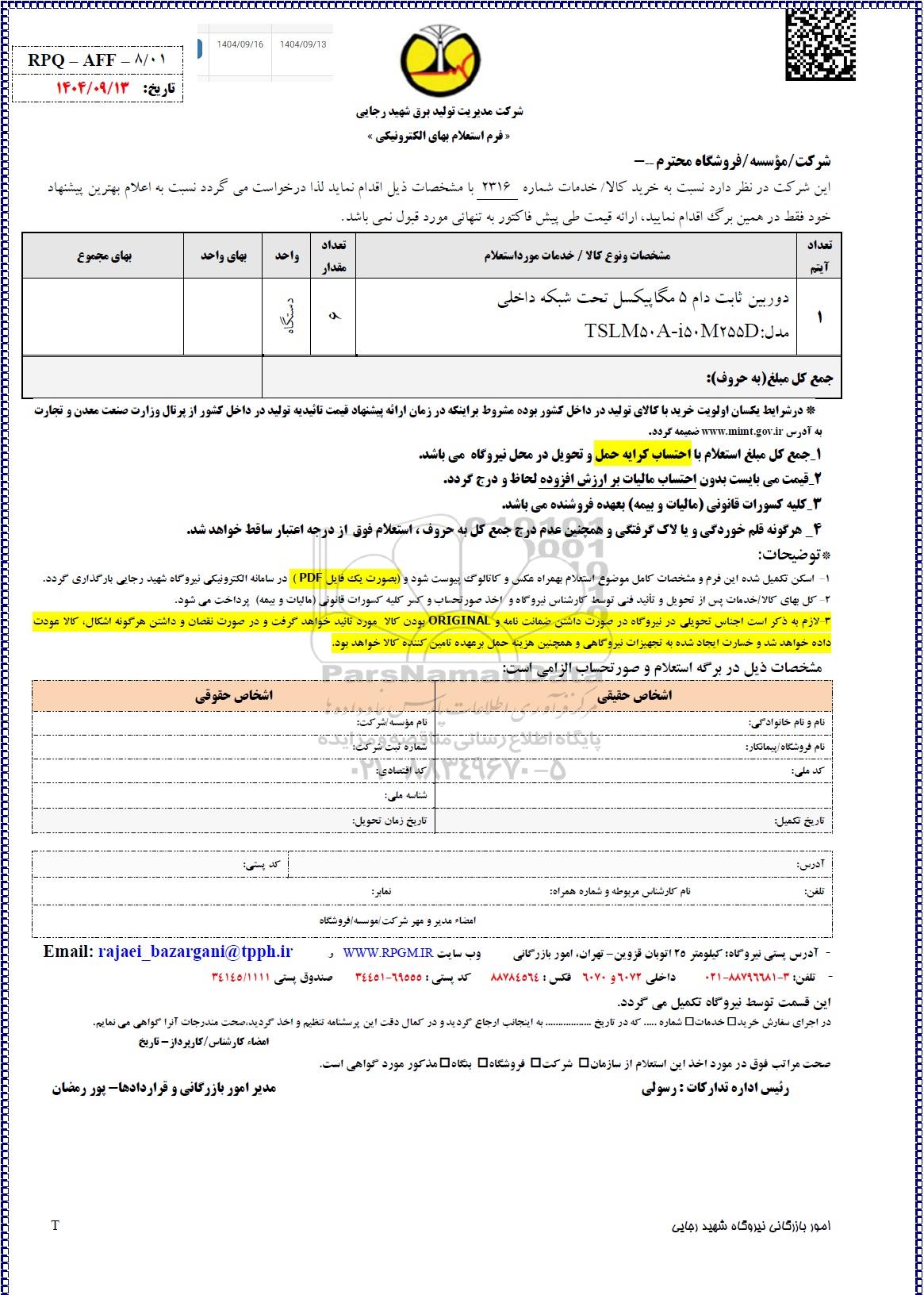 شرکت مدیریت تولید برق شهید رجایی فرم استعلام بهای الکترونیکی