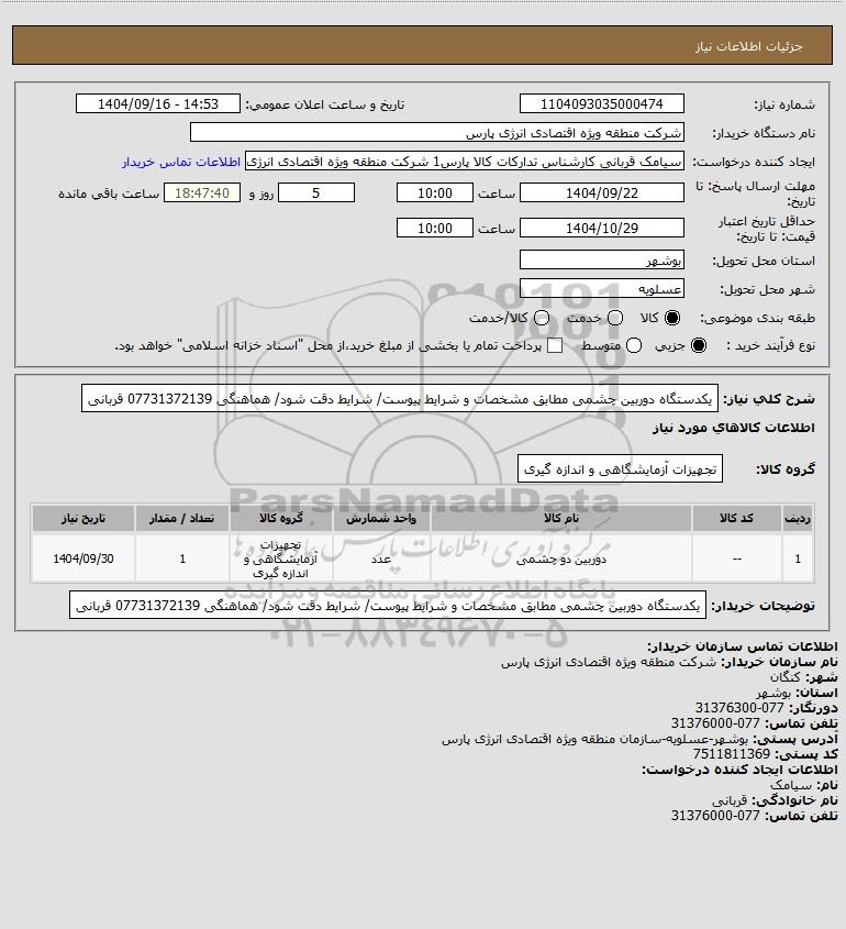 شرح کلی نیاز: یکدستگاه دوربین چشمی مطابق مشخصات و شرایط پیوست/ شرایط دقت شود/ هماهنگی 07731372139 قربانی