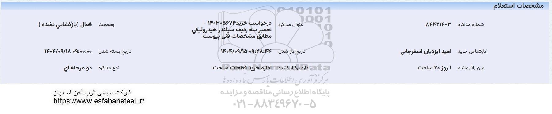 عنوان مذاکره درخواست خرید 140305674 - تعمیر سه رديف سيلندر هيدروليكی مطابق مشخصات فنی پیوست