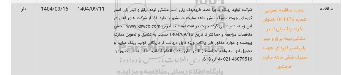 | مناقصه | تمدید مناقصه عمومی شماره 041176 با عنوان خرید رنگ پلی استر مشکی نیمه براق و تینر پلی استر کوره ای جهت مصرف شش ماهه سایت خرمشهر | شرکت تولید رینگ سایپا قصد خرید رنگ پلی استر مشکی نیمه براق و تینر پلی استر کوره ای جهت مصرف شش ماهه سایت خرمشهر را دارد. لذا از شرکت های فعال در این زمینه دعوت میگردد جهت دریافت اسناد به آدرس www.kswco.com بخش مناقصات مراجعه و حداکثر تا تاریخ 1404.9.16 نسبت به تکمیل و تحویل مدارک پیوست و موارد مذکور طی پاکات ویژه قابل دریافت از بازرگانی تولید رینگ سایپا و تحویل آنها به واحد حراست (آقای زمان زاده) اقدام فرمائید. تلفن تماس ضروری 46079516-021 داخلی 618 | 1404.9.11 | 1404.9.16 |