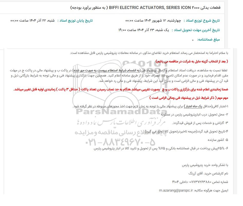 استعلام بها و موضوع استعلام استعلام قطعات یدکی 2000 BIFFI ELECTRIC ACTUARORS SERIES ICON به اطلاع کلیه شرکتها و افراد متخصص واجد شرایط میرساند، آگهی گذار در نظر دارد از طریق استعلام بها، نسبت به انتخاب و دریافت پیشنهادات اقدام نماید. این استعلام با کد آگهی ثبت شده در سامانه خبرگزاری پارس نماد : 9958378 منتشر شده است. مشخصات استعلام : تاریخ شروع استعلام: 1404/09/16 آخرین مهلت ارسال پیشنهاد قیمت : 1404/09/22 و محل اجرای پروژه : استان مناقصات استان بوشهر میباشد. استعلام قیمت مورد درخواست : استعلام قطعات یدکی 2000 BIFFI ELECTRIC ACTUARORS SERIES ICON با دستهبندیهای تخصصی و گروه های مرتبط : شیرآلات, اتوماسیون ، مراکز کنترل صنعتی, تجهیزات نفت و گاز, تجهیزات برق و الکترونیک, استعلام اطلاع رسانی میگردد.