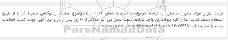 شرکت پارس فولاد سبزوار در نظر دارد قرارداد درخواست خدمات شماره 404924 با موضوع عملیات رادیوگرافی خطوط گاز را از طریق استعلام منعقد نماید. لذا از کلیه پیمانکاران واجد شرایط دعوت بعمل می آید حداکثر تا 10 روز پس از درج این آگهی جهت کسب اطلاعات بیشتر با شماره تلفن 05144024445 و یا 09330150624 تماس حاصل نمایند.
