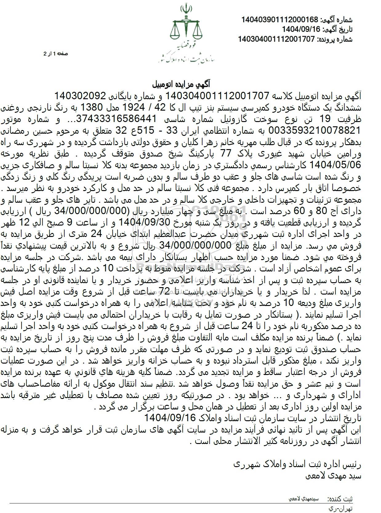 آگهی مزایده اتومبیل کلاسه 140304001112001707 و شماره بایگانی 140302092 ششدانگ یک دستگاه خودرو کمپرسی سیستم بنز تیپ ال کا 42 / 1924 مدل 1380 به رنگ نارنجی روغنی ظرفیت 19 تن نوع سوخت گازوئیل شماره شاسی 37433316586441... و شماره موتور 0033593210078821 به شماره انتظامی ایران 33 - 515 ع 32 متعلق به مرحوم حسین رمضانی بدهکار پرونده که در قبال طلب مهریه خانم زهرا کلیان و حقوق دولتی بازداشت گردیده و در شهرری سه راه ورامین خیابان شهید غیوری پلاک 77 پارکینگ شیخ صدوق متوقف گردیده . طبق نظریه مورخه 1404.05.06 کارشناس رسمی دادگستری در زمان بازدید مجموعه بدنه کلا نسبتا سالم و صافکاری جزیی و رنگ شده است شاسی های جلو و عقب دو طرف سالم و بدون ضربه است پریدگی رنگ کلی و زنگ زدگی خصوصا اتاق بار کمپرس دارد. مجموعه فنی کلا نسبتا سالم در حد مدل و کارکرد خودرو به نظر میرسد . مجموعه تزئینات و تجهیزات داخلی و خارجی کلا سالم و در حد مدل میباشد. تایرهای جلو و عقب سالم و دارای آج 80 و 60 درصد است . به مبلغ سی و چهار میلیارد ریال (34.000.000.000 ریال ) ارزیابی گردیده و ارزیابی قطعیت یافته و در روز یک شنبه مورخ 1404.09.30 و از ساعت 9 صبح الی 12 ظهر در واحد اجرای اداره ثبت شهرری میدان حضرت عبدالعظیم ابتدای خیابان 24 متری از طریق مزایده به فروش می رسد. مزایده از مبلغ مبلغ 34.000.000.000 ریال شروع و به بالاترین قیمت پیشنهادی نقدا فروخته می شود. ضمنا مورد مزایده حسب اظهار بستانکار دارای بیمه میباشد شرکت در جلسه مزایده برای عموم اشخاص آزاد است. شرکت در جلسه مزایده منوط به پرداخت 10 درصد از مبلغ پایه کارشناسی به حساب سپرده ثبت و پس از اخذ شناسه واریز اعلامی و حضور خریدار و یا نماینده قانونی او در جلسه مزایده است. لذا خریدار و یا خریداران میبایست تا 72 ساعت قبل از شروع وقت مزایده اصل فیش واریزی مبلغ ودیعه 10 درصد به نام خود و تحت شناسه اعلامی را به همراه درخواست کتبی خود به واحد اجرا تسلیم نمایند . ) بستانکار در صورت تمایل به رقابت با خریداران احتمالی می بایست فیش واریزی مبلغ ده درصد مذکور به نام خود را تا 24 ساعت قبل از شروع به همراه درخواست کتبی خود به واحد اجرا تسلیم نماید . ضمنا برنده مزایده مکلف است ما به التفاوت مبلغ فروش را ظرف مدت پنج روز از تاریخ مزایده به حساب صندوق ثبت تودیع نماید و در صورتی که ظرف مهلت مقرر مانده فروش را به حساب سپرده ثبت واریز نکند ، مبلغ مذکور قابل استرداد نبوده و به حساب خزانه واریز خواهد شد. در این صورت عملیات فروش از درجه اعتبار ساقط و مزایده تجدید میگردد ضمنا کلیه هزینه های قانونی به عهده برنده مزایده است و نیم عشر و حق مزایده نقداً وصول خواهد شد تنظیم سند انتقال موکول به ارائه مفاصا حساب های ادارای و شهرداری و ... خواهد بود . در صورتیکه روز تعیین شده مصادف با تعطیلی غیر مترقبه باشد مزایده اولین روز اداری بعد از تعطیل در همان محل و ساعت برگزار می گردد .