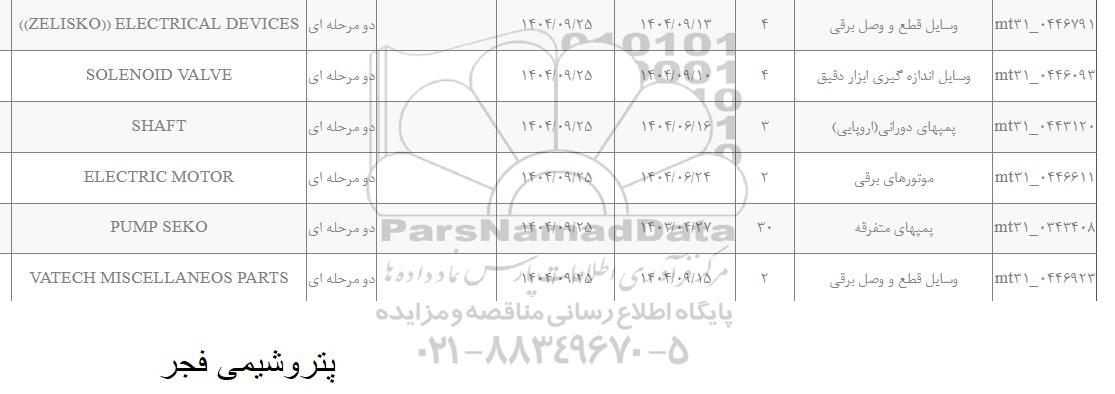 | MT31-0446923 | وسایل قطع و وصل برقی | 2 | 1404.09.15 | 1404.09.25 | دو مرحله ای | VATECH MISCHELLANEOS PARTS |