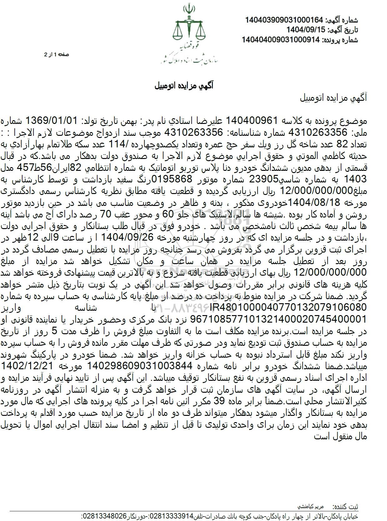 موضوع پرونده به کلاسه 140400961 علیرضا استادی نام پدر بهمن تاریخ تولد 1369.01.01 شماره ملی: 4310263356 شماره شناسنامه 4310263356 موجب سند ازدواج موضوعات لازم الاجرا : تعداد 82 عدد شاخه گل رز ویک سفر حج عمره و تعداد یکصد و چهارده 114 عدد سکه طلا تمام بهار آزادی به حدیثه کاظمی الموتی و حقوق اجرایی موضوع لازم الاجرا به صندوق دولت بدهکار می باشد. که در قبال قسمتی از بدهی مدیون ششدانگ خودرو دنا پلاس توربو اتوماتیک به شماره انتظامی 82 ایران 45756 مدل 1403 به شماره شاسی 23905 شماره موتور 0195868 رنگ سفید بازداشت و توسط کارشناس به مبلغ 12.000.000.000 ریال ارزیابی گردیده و قطعیت یافته مطابق نظریه کارشناس رسمی دادگستری مورخه 1404.08.18 خودروی مذکور ، بدنه و ظاهر در وضعیت مناسب میباشد در حین بازدید موتور روشن و آماده کار بوده شیشه ها سالم لاستیکهای جلو 60 و محور عقب 70 رصد دارای آج می باشد آینه ها سالم بیمه شخص ثالث نامشخص میباشد. خودرو فوق در قبال طلب بستانکار و حقوق اجرایی دولت ، بازداشت و در جلسه مزایده ای که در روز چهارشنبه مورخه 1404/09/26 از ساعت 9 الی 12 ظهر در اجرای ثبت قزوین برگزار میگردد بفروش میرسد چنانچه روز مزایده با تعطیل رسمی مصادف گردد در روز بعد از تعطیل جلسه مزایده در همان ساعت و مکان تشکیل خواهد شد مزایده از مبلغ 12.000.000.000 ریال بهای ارزیابی قطعیت یافته شروع و به بالاترین قیمت پیشنهادی فروخته خواهد شد کلیه هزینه های قانونی برابر مقررات وصول خواهد شد این آگهی در یک نوبت بتاریخ ذیل متشر خواهد گردید. ضمنا شرکت در مزایده منوط به پرداخت ده درصد از مبلغ پایه کارشناسی به حساب سپرده به شمارهIR4801000040770132079106080 با شناسه واریز