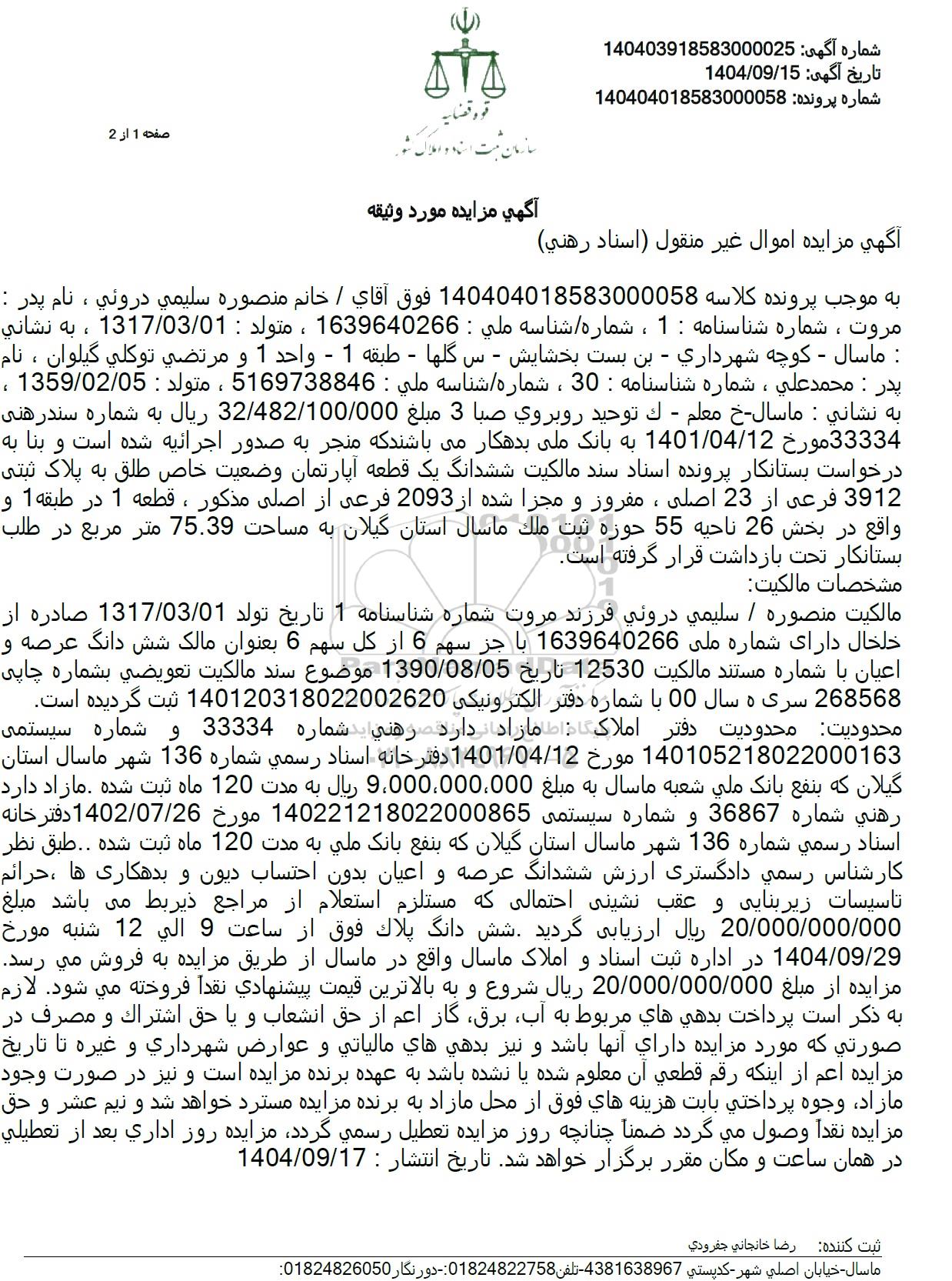 به موجب پرونده کلاسه 140404018583000058 فوق آقای . خانم منصوره سلیمی درونی ، نام پدر : مروت ، شماره شناسنامه : 1 ، شماره شناسه ملی : 1639640266 ، متولد : 1317.03.01 ، به نشانی ماسال - کوچه شهرداری - بن بست بخشایش - س گلها - طبقه 1 - واحد 1 و مرتضی توکلی گیلوان ، نام پدر : محمد علی ، شماره شناسنامه : 30 ، شماره شناسه ملی : 5169738846 ، متولد : 1359.02.05 ، به نشانی : ماسال - خ معلم - ک توحید روبروی صبا 3 مبلغ 32.482.100.000 ریال به شماره سندرهنی 33334 مورخ 1401.04.12 به بانک ملی بدهکار می باشند که منجر به صدور اجرائیه شده است و بنا به درخواست بستانکار پرونده اسناد سند مالکیت ششدانگ یک قطعه آپارتمان وضعیت خاص طلق به پلاک ثبتی 3912 فرعی از 23 اصلی ، مفروز و مجزا شده از 2093 فرعی از اصلی مذکور ، قطعه 1 در طبقه 1 و واقع در بخش 26 ناحیه 55 حوزه ثبت ملک ماسال استان گیلان به مساحت 75.39 متر مربع در طلب بستانکار تحت بازداشت قرار گرفته است.