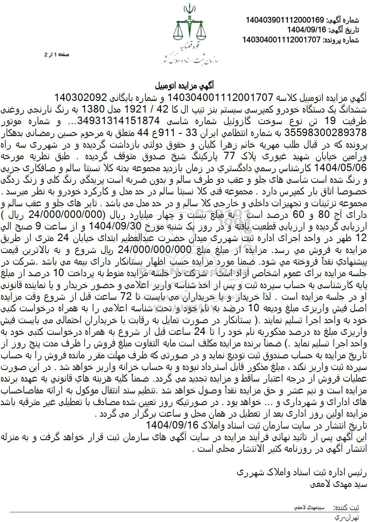 آگهی مزایده اتومبیل کلاسه 140304001112001707 و شماره بایگانی 140302092 ششدانگ یک دستگاه خودرو کمپرسی سیستم بنز تیپ ال کا 42 / 1921 مدل 1380 به رنگ نارنجی روغنی ظرفیت 19 تن نوع سوخت گازوئیل شماره شاسی 34931314151874 ... و شماره موتور 35598300289378 به شماره انتظامی ایران 33 - 911 ع 44 متعلق به مرحوم حسین رمضانی بدهکار پرونده که در قبال طلب مهریه خانم زهرا کلیان و حقوق دولتی بازداشت گردیده و در شهرری سه راه ورامین خیابان شهید غیوری پلاک 77 پارکینگ شیخ صدوق متوقف گردیده . طبق نظریه مورخه 1404.05.06 کارشناس رسمی دادگستری در زمان بازدید مجموعه بدنه كلا نسبتا سالم و صافکاری جزیی و رنگ شده است شاسی های جلو و عقب دو طرف سالم و بدون ضربه است پریدگی رنگ کلی و زنگ زدگی خصوصا اتاق بار کمپرس دارد. مجموعه فنی کلا نسبتا سالم در حد مدل و کارکرد خودرو به نظر میرسد . مجموعه تزئینات و تجهیزات داخلی و خارجی کلا سالم و در حد مدل میباشد. تایرهای جلو و عقب سالم و دارای آج 80 و 60 درصد است. به مبلغ بیست و چهار میلیارد ریال (24.000.000.000 ریال ) ارزیابی گردیده و ارزیابی قطعیت یافته و در روز یک شنبه مورخ 1404.09.30 و از ساعت 9 صبح الی 12 ظهر در واحد اجرای اداره ثبت شهرری میدان حضرت عبدالعظیم ابتدای خیابان 24 متری از طریق مزایده به فروش می رسد. مزایده از مبلغ مبلغ 24.000.000.000 ریال شروع و به بالاترین قیمت پیشنهادی نقدا فروخته می شود. ضمنا مورد مزایده حسب اظهار بستانکار دارای بیمه می باشد . شرکت در جلسه مزایده برای عموم اشخاص آزاد است. شرکت در جلسه مزایده منوط به پرداخت 10 درصد از مبلغ پایه کارشناسی به حساب سپرده ثبت و پس از اخذ شناسه واریز اعلامی و حضور خریدار و یا نماینده قانونی او در جلسه مزایده است. لذا خریدار و یا خریداران می بایست تا 72 ساعت قبل از شروع وقت مزایده اصل فیش واریزی مبلغ ودیعه 10 درصد به نام خود و تحت شناسه اعلامی را به همراه درخواست کتبی خود به واحد اجرا تسلیم نمایند . بستانکار در صورت تمایل به رقابت با خریداران احتمالی می بایست فیش واریزی مبلغ ده درصد مذکور به نام خود را تا 24 ساعت قبل از شروع به همراه درخواست کتبی خود به واحد اجرا تسلیم نماید . ضمنا برنده مزایده مکلف است ما به التفاوت مبلغ فروش را ظرف مدت پنج روز از تاریخ مزایده به حساب صندوق ثبت تودیع نماید و در صورتی که ظرف مهلت مقرر مانده فروش را به حساب سپرده ثبت واریز نکند، مبلغ مذکور قابل استرداد نبوده و به حساب خزانه واریز خواهد شد . در این صورت عملیات فروش از درجه اعتبار ساقط و مزایده تجدید میگردد ضمنا کلیه هزینه های قانونی به عهده برنده مزایده است و نیم عشر و حق مزایده نقداً وصول خواهد شد . تنظیم سند انتقال موکول به ارائه مفاصا حساب های ادارای و شهرداری و خواهد بود. در صورتیکه روز تعیین شده مصادف با تعطیلی غیر مترقبه باشد