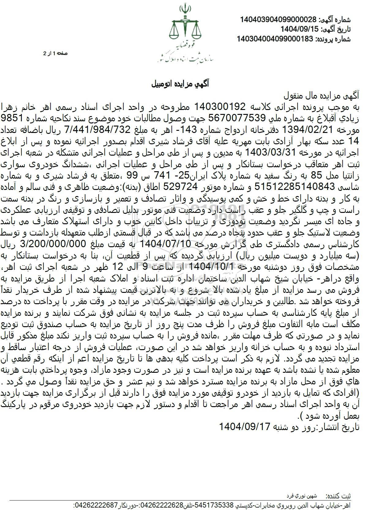 به موجب پرونده اجرائی کلاسه 140300192 مطروحه در واحد اجرای اسناد رسمی اهر خانم زهرا زیادی اقبلاغ به شماره ملی 5670077539 جهت وصول مطالبات خود موضوع سند نکاحیه شماره 9851 مورخه 1394.02.21 دفترخانه ازدواج شماره 143 اهر به مبلغ 7.441.984.732 ریال باضافه تعداد 14 عدد سکه بهار آزادی بابت مهریه علیه آقای فرشاد شیری اقدام بصدور اجرائیه نموده و پس از ابلاغ اجرائیه در مورخه 1403.03.31 به مدیون و پس از طی مراحل و عملیات اجرائی متشکله در شعبه اجرای ثبت اهر متعاقب درخواست بستانکار و پس از طی مراحل و عملیات اجرائی ششدانگ خودروی سواری زانتیا مدل 85 به رنگ سفید به شماره پلاک ایران 25 741 س 99 ، متعلق به فرشاد شیری و به شماره شاسی 51512285140843 و شماره موتور 529724 اطاق (بدنه) وضعیت ظاهری و فنی سالم و آماده به کار و بدنه دارای خط و خش و کمی پوسیدگی و واثار تصادف و تعمیر و بازسازی و رنگ در بدنه سمت راست و چپ و گلگیر جلو و عقب راست دارد وضعیت فنی موتور بدلیل تصادفی و توقیفی ارزیابی عملکردی و جاده ای میسر نگردید وضعیت تودوزی و تزییات داخل کابین خوب و دارای استهلاک متعارف می باشد وضعیت لاستیک جلو و عقب حدود پنجاه درصد می باشد که در قبال قسمتی از طلب متعهدله بازداشت و توسط کارشناس رسمی دادگستری طی گزارش مورخه 1404.07.10 به قیمت مبلغ 3.200.000.000 ریال سه میلیارد و دویست میلیون ریال ارزیابی گردیده که پس از قطعیت آن بنا به درخواست بستانکار به مشخصات فوق روز دوشنبه مورخه 1404.10.1 از ساعت 9 الى 12 ظهر در شعبه اجرای ثبت اهر واقع در اهر - خیابان شیخ شهاب الدین ساختمان اداره ثبت اسناد و املاک شعبه اجرا از طریق مزایده به فروش میرسد مزایده از مبلغ یاد شده بالا شروع و به بالاترین قیمت پیشنهاد شده از طرف خریدار نقداً فروخته خواهد شد. طالبین و خریداران میتوانند جهت شرکت در مزایده در وقت مقرر با پرداخت ده درصد از مبلغ پایه کارشناسی به حساب سپرده ثبت در جلسه مزایده به نشانی فوق شرکت نمایند و برنده مزایده مکلف است ما به التفاوت مبلغ فروش را ظرف مدت پنج روز از تاریخ مزایده به حساب صندوق ثبت تودیع نماید و در صورتی که ظرف مهلت مقرر ، مانده فروش را به حساب سپرده ثبت واریز نکند مبلغ مذکور قابل استرداد نبوده و به حساب خزانه واریز خواهد شد در این صورت عملیات فروش از درجه اعتبار ساقط و مزایده تجدید میگردد. لازم به ذکر است پرداخت کلیه بدهیها تا تاریخ مزایده اعم از اینکه رقم قطعی آن معلوم شده یا نشده باشد به عهده برنده مزایده است و نیز در صورت وجود مازاد وجوه پرداختی بابت هزینه های فوق از محل مازاد به برنده مزایده مسترد خواهد شد و نیم عشر و حق مزایده نقدا وصول می گردد . افرادی که تمایل به بازدید از خودرو توقیفی مورد مزایده فوق را دارند قبل از برگزاری مزایده جهت بازدید آن به واحد اجرای اسناد رسمی اهر مراجعت تا اقدام و دستور لازم جهت بازدید خودروی مرقوم در پارکینگ بعمل آورده شود