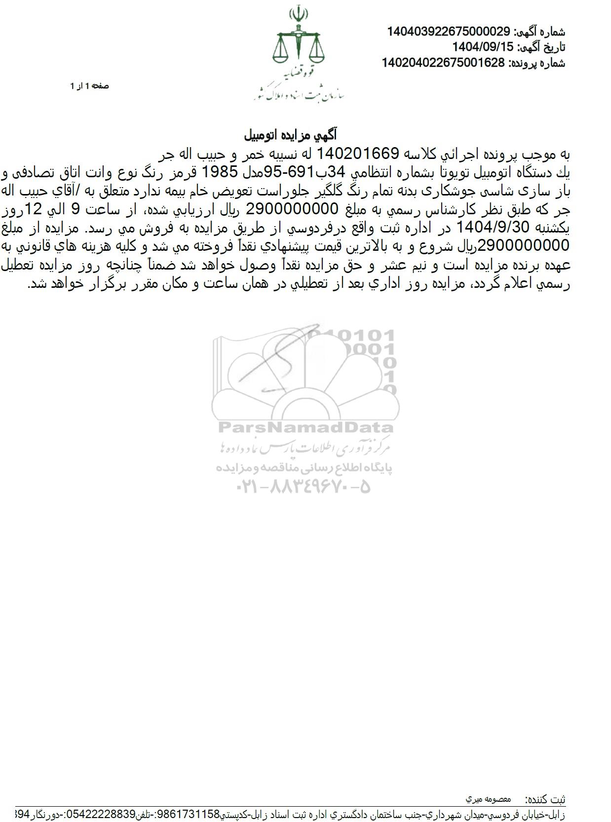 یک دستگاه اتومبیل تویوتا بشماره انتظامی 34 ب 691-95 مدل 1985 قرمز رنگ نوع وانت اتاق تصادفی و باز سازی شاسی جوشکاری بدنه تمام رنگ گلگیر جلوراست تعویض خام بیمه ندارد متعلق به / آقای حبیب اله جر که طبق نظر کارشناس رسمی به مبلغ 2900000000 ریال ارزیابی شده از ساعت 9 الی 12 روز یکشنبه 1404.09.30 در اداره ثبت واقع در فردوسی از طریق مزایده به فروش می رسد. مزایده از مبلغ 2900000000 ریال شروع و به بالاترین قیمت پیشنهادی نقدا فروخته میشد و کلیه هزینه های قانونی به عهده برنده مزایده است و نیم عشر و حق مزایده نقدا وصول خواهد شد ضمنا چنانچه روز مزایده تعطیل رسمی اعلام گردد مزایده روز اداری بعد از تعطیلی در همان ساعت و مکان مقرر برگزار خواهد شد.