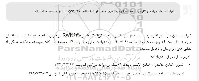 شرکت سیمان داراب در نظر دارد نسبت به تهیه و تامین دو عدد کوپلینگ فلندر RWN630  از طریق مناقصه اقدام نماید. متقاضیان میتوانند تا ساعت 14 روز SI شنبه تاریخ 1404.09.18 ، پیشنهادات مالی خود را با ذکر موضوع در پاکات سربسته جداگانه به یکی از نشانیهای زیر ارسال و تحویل نمایند.