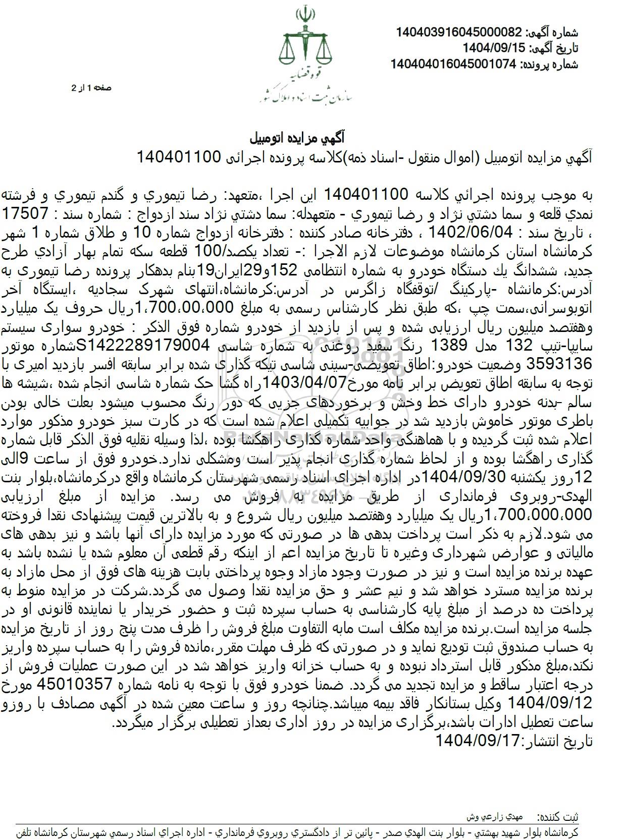 به موجب پرونده اجرائی کلاسه 140401100 این اجرا ، متعهد رضا تیموری و گندم تیموری و فرشته نمدی قلعه و سما دشتی نژاد و رضا تیموری - متعهدله سما دشتی نژاد سند ازدواج : شماره سند : 17507 ، تاریخ سند : 1402.06.04 ، دفتر خانه صادر کننده : دفترخانه ازدواج شماره 10 و طلاق شماره 1 شهر کرمانشاه استان کرمانشاه موضوعات لازم الاجرا : تعداد یکصد . 100 قطعه سکه تمام بهار آزادی طرح جدید ششدانگ یک دستگاه خودرو به شماره انتظامی 152 و 29 ایران 19 بنام بدهکار پرونده رضا تیموری به آدرس : کرمانشاه - پارکینگ توقفگاه زاگرس در آدرس کرمانشاه انتهای شهرک سجادیه ، ایستگاه آخر اتوبوسرانی سمت چپ که طبق نظر کارشناس رسمی به مبلغ 1.700.000.000 ریال حروف یک میلیارد و هفتصد میلیون ریال ارزیابی شده و پس از بازدید از خودرو شماره فوق الذکر : خودرو سواری سیستم سایپا تیپ 132 مدل 1389 رنگ سفید روغنی به شماره شاسی S1422289179004 شماره موتور 3593136 وضعیت خودرو اطاق تعویضی - سینی شاسی تیکه گذاری شده برابر سابقه افسر بازدید امیری با توجه به سابقه اطاق تعویض برابر نامه مورخ 1403.04.07 راه گشا حک شماره شاسی انجام شده ، شیشه ها سالم بدنه خودرو دارای خط وخش و برخوردهای جزیی که دور رنگ محسوب میشود بعلت خالی بودن باطری موتور خاموش بازدید شد در جوابیه تکمیلی اعلام شده است که در کارت سبز خودرو مذکور موارد اعلام شده ثبت گردیده و با هماهنگی واحد شماره گذاری راهگشا بوده ، لذا وسیله نقلیه فوق الذکر قابل شماره گذاری راهگشا بوده و از لحاظ شماره گذاری انجام پذیر است و مشکلی ندارد. خودرو فوق از ساعت 9 الی 12 روز یکشنبه 1404.09.30 در اداره اجرای اسناد رسمی شهرستان کرمانشاه واقع در کرمانشاه بلوار بنت الهدی - روبروی فرمانداری از طریق مزایده به فروش می رسد. مزایده از مبلغ ارزیابی 700.000.000. 1 ریال یک میلیارد و هفتصد میلیون ریال شروع و به بالاترین قیمت پیشنهادی نقدا فروخته می شود. لازم به ذکر است پرداخت بدهی ها در صورتی که مورد مزایده دارای آنها باشد و نیز بدهی های مالیاتی و عوارض شهرداری و غیره تا تاریخ مزایده اعم از اینکه رقم قطعی آن معلوم شده یا نشده باشد به عهده برنده مزایده است و نیز در صورت وجود مازاد وجوه پرداختی بابت هزینه های فوق از محل مازاد به برنده مزایده مسترد خواهد شد و نیم عشر و حق مزایده نقدا وصول می گردد. شرکت در مزایده منوط به پرداخت ده درصد از مبلغ پایه کارشناسی به حساب سپرده ثبت و حضور خریدار یا نماینده قانونی او در جلسه مزایده است. برنده مزایده مکلف است ما به التفاوت مبلغ فروش را ظرف مدت پنج روز از تاریخ مزایده به حساب صندوق ثبت تودیع نماید و در صورتی که ظرف مهلت مقرر مانده فروش را به حساب سپرده واریز نکند مبلغ مذکور قابل استرداد نبوده و به حساب خزانه واریز خواهد شد در این صورت عملیات فروش از درجه اعتبار ساقط و مزایده تجدید میگردد. ضمنا خودرو فوق با توجه به نامه شماره 45010357 مورخ 1404.09.12 وکیل بستانکار فاقد بیمه میباشد. چنانچه روز و ساعت معین شده در آگهی مصادف با روزو ساعت تعطیل ادارات باشد برگزاری مزایده در روز اداری بعد از تعطیلی برگزار میگردد.