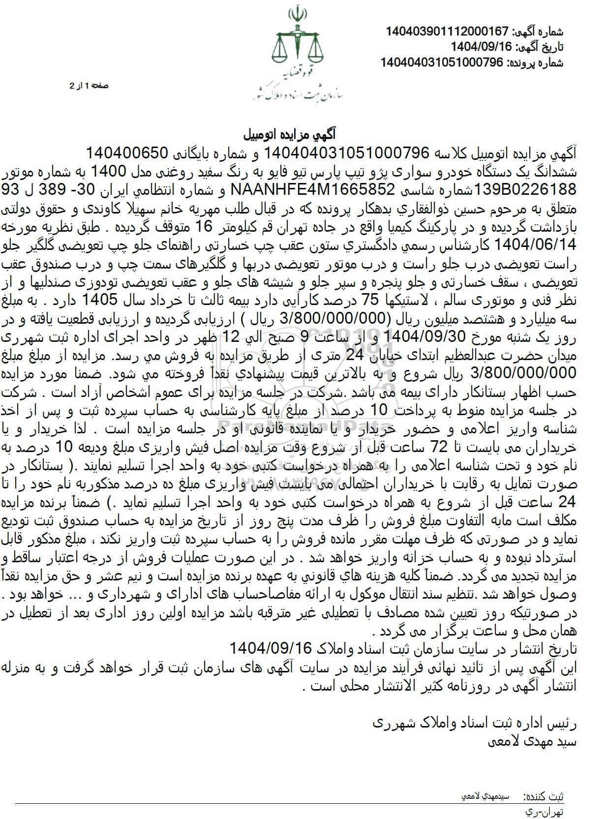 آگهی مزایده اتومبیل کلاسه 140404031051000796 و شماره بایگانی 140400650