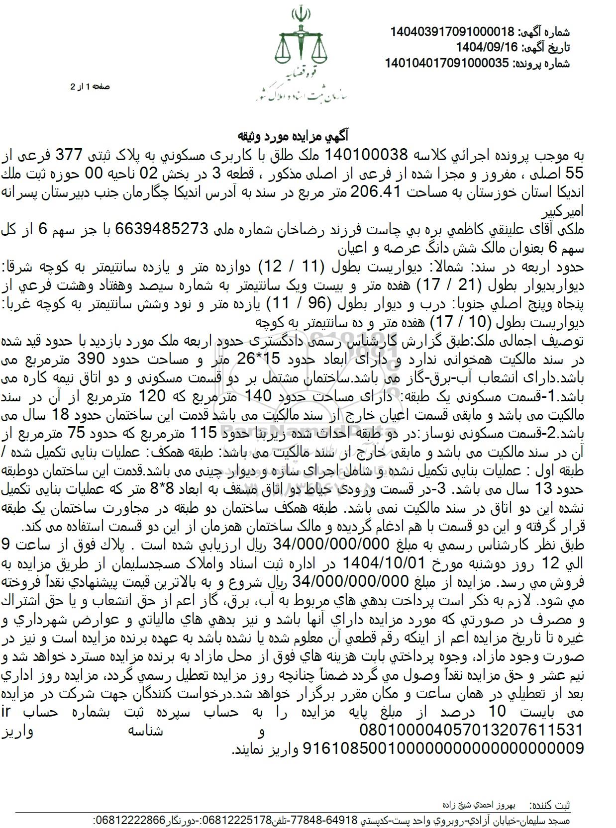 به موجب پرونده اجرائی کلاسه 140100038 ملک طلق با کاربری مسکونی به پلاک ثبتی 377 فرعی از 55 اصلی ، مفروز و مجزا شده از فرعی از اصلی مذکور ، قطعه 3 در بخش 02 ناحیه 00 حوزه ثبت ملک اندیکا استان خوزستان به مساحت 206.41 متر مربع در سند به آدرس اندیکا چگارمان جنب دبیرستان پسرانه امیر کبیر ملکی آقاى علینقی کاظمی بره بی چاست فرزند رضاخان شماره ملی 6639485273 با جز سهم 6 از کل سهم 6 بعنوان مالک شش دانگ عرصه و اعیان حدود اربعه در سند شمالا دیواریست بطول (11) . (12) دوازده متر و یازده سانتیمتر به کوچه شرقا دیوار بدیوار بطول (21) . (17) هفده متر و بیست و یک سانتیمتر به شماره سیصد و هفتاد و هشت فرعی از پنجاه و پنج اصلی جنوبا درب و دیوار بطول (96) . (11) یازده متر و نود و شش سانتیمتر به کوچه غربا دیواریست بطول 10 . 17 هفده متر و ده سانتیمتر به کوچه توصیف اجمالی ملک طبق گزارش کارشناس رسمی دادگستری حدود اربعه ملک مورد بازدید با حدود قید شده در سند مالکیت همخوانی ندارد و دارای ابعاد حدود 2615 متر و مساحت حدود 390 متر مربع می باشد. دارای انشعاب آب برق گاز می باشد. ساختمان مشتمل بر دو قسمت مسکونی و دو اتاق نیمه کاره می باشد . 1 - قسمت مسکونی یک طبقه دارای مساحت حدود 140 متر مربع که 120 متر مربع از آن در سند مالکیت میباشد و مابقی قسمت اعیان خارج از سند مالکیت میباشد قدمت این ساختمان حدود 18 سال می باشد. 2- قسمت مسکونی نوساز در دو طبقه احداث شده زیربنا حدود 115 متر مربع که حدود 75 متر مربع از آن در سند مالکیت می باشد و مابقی خارج از سند مالکیت می باشد طبقه همکف عملیات بنایی تکمیل شده .طبقه اول : عملیات بنایی تکمیل نشده و شامل اجرای سازه و دیوار چینی می باشد. قدمت این ساختمان دو طبقه حدود 13 سال می باشد. -3- در قسمت ورودی حیاط دو اتاق مسقف به ابعاد 88 متر که عملیات بنایی تکمیل نشده این دو اتاق در سند مالکیت نمی باشد. طبقه همکف ساختمان دو طبقه در مجاورت ساختمان یک طبقه قرار گرفته و این دو قسمت با هم ادغام گردیده و مالک ساختمان همزمان از این دو قسمت استفاده می کند. طبق نظر کارشناس رسمی به مبلغ 34.000.000.000 ریال ارزیابی شده است. پلاک فوق از ساعت 9 الی 12 روز دوشنبه مورخ 1404.10.01 در اداره ثبت اسناد و املاک مسجد سلیمان از طریق مزایده به فروش می رسد. مزایده از مبلغ 34.000.000.000 ریال شروع و به بالاترین قیمت پیشنهادی نقدا فروخته می شود. لازم به ذکر است پرداخت بدهی های مربوط به آب برق گاز اعم از حق انشعاب و یا حق اشتراک و مصرف در صورتی که مورد مزایده دارای آنها باشد و نیز بدهی های مالیاتی و عوارض شهرداری و غیره تا تاریخ مزایده اعم از اینکه رقم قطعی آن معلوم شده یا نشده باشد به عهده برنده مزایده است و نیز در صورت وجود مازاد وجوه پرداختی بابت هزینه های فوق از محل مازاد به برنده مزایده مسترد خواهد شد و نیم عشر و حق مزایده نقدا وصول می گردد ضمنا چنانچه روز مزایده تعطیل رسمی گردد، مزایده روز اداری بعد از تعطیلی در همان ساعت و مکان مقرر برگزار خواهد شد. درخواست کنندگان جهت شرکت در مزایده می بایست 10 درصد از مبلغ پایه مزایده را به حساب سپرده ثبت بشماره حساب 080100004057013207611531 ir و شناسه واریز 916108500100000000000000000009 واریز نمایند