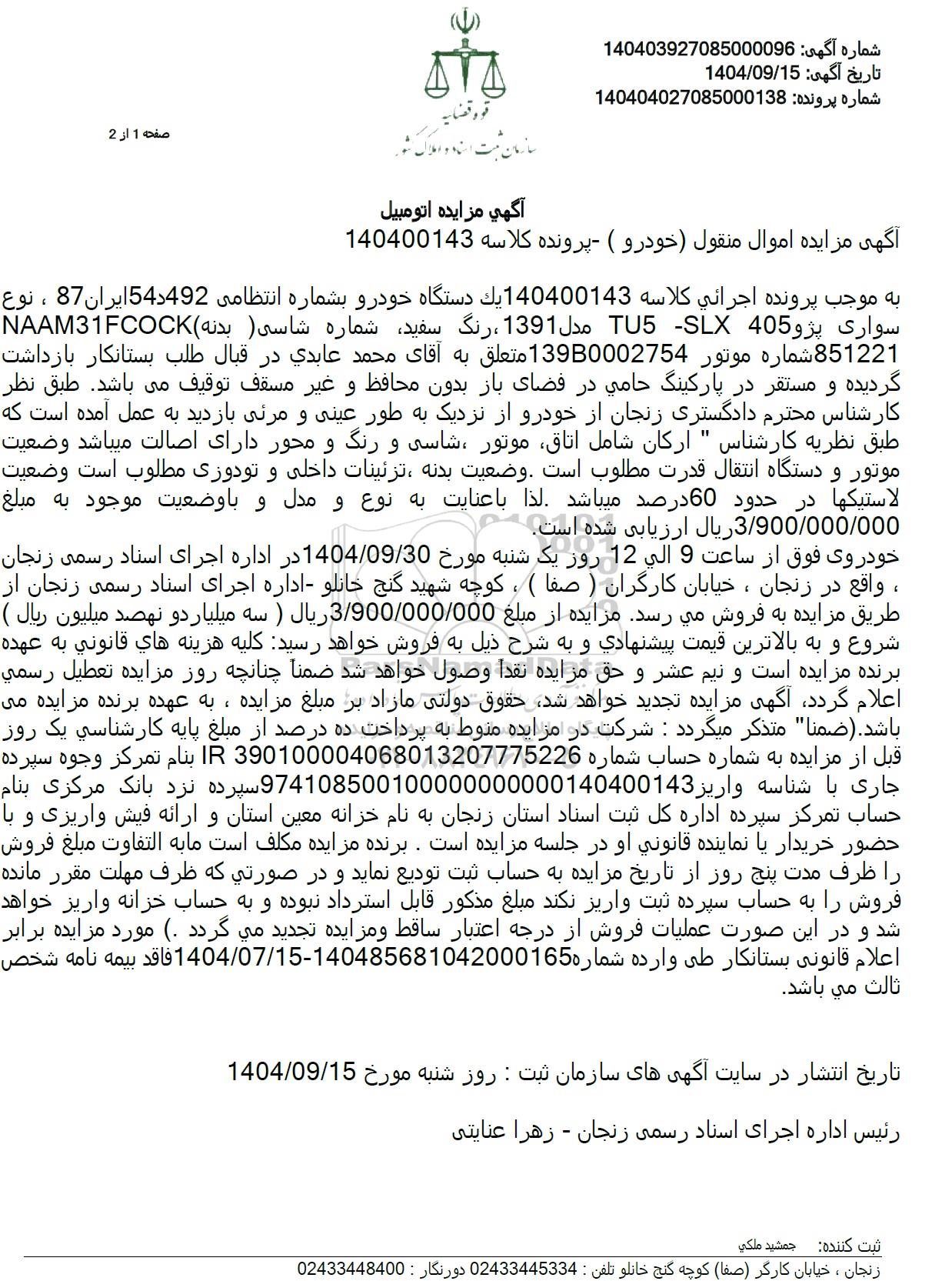 آگهی مزایده اموال منقول خودرو ) پرونده کلاسه 140400143