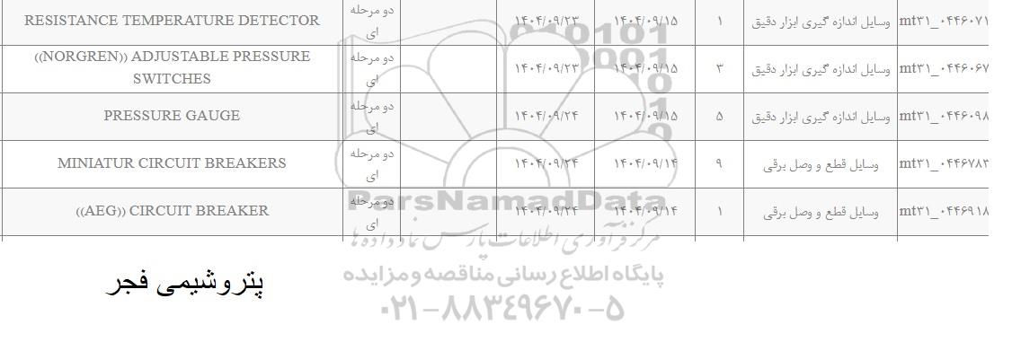 | m31-0446098 | وسایل اندازه گیری ابزار دقیق | 5 | 1404.9.24 | دو مرحله ای | PRESSURE GAUGE |