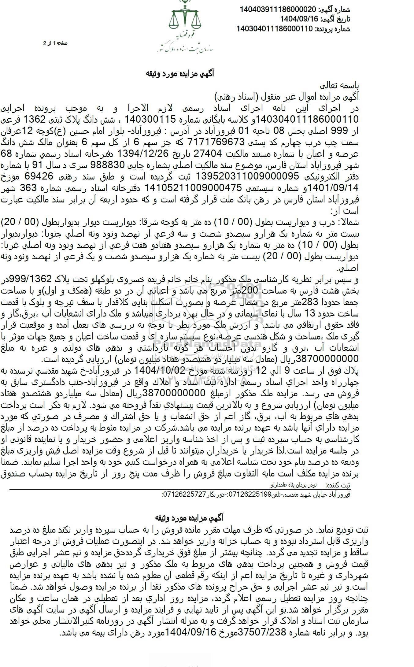 پلاک فوق از ساعت 9 الی 12 روزسه شنبه مورخ 1404.10.02 در فیروز آباد خ شهید مقدسی نرسیده به چهارراه واحد اجرای اسناد رسمی اداره ثبت اسناد و املاک واقع در فیروز آباد جنب دادگستری سابق به فروش می رسد. مزایده ملک مذکور از مبلغ 38700000000 ریال معادل سه میلیارد و هشتصد و هفتاد میلیون تومان ارزیابی شروع و به بالاترین قیمت پیشنهادی نقدا فروخته می شود. لازم به ذکر است پرداخت بدهی های مربوط به آب برق گاز اعم از حق انشعاب و یا حق اشتراک و مصرف در صورتی که مورد مزایده دارای آنها باشد به عهده برنده مزایده می باشد. شرکت در مزایده منوط به پرداخت ده درصد از مبلغ کارشناسی به حساب سپرده ثبت و پس از اخذ شناسه واریز اعلامی و حضور خریدار و یا نماینده قانونی او در جلسه مزایده است. لذا خریدار با خریداران میتوانند تا قبل از شروع وقت مزایده اصل فیش واریزی مبلغ ودیعه ده درصد بنام خود تحت شناسه اعلامی به همراه درخواست کتبی خود به واحد اجرا تسلیم نمایند. ضمنا برنده مزایده مکلف است ما به التفاوت مبلغ فروش را ظرف مدت پنج روز از تاریخ مزایده بحساب صندوق