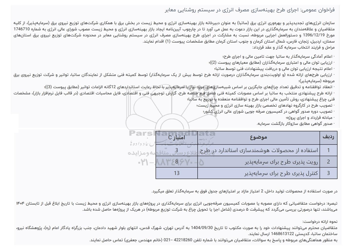 سازمان انرژیهای تجدیدپذیر و بهره وری انرژی برق (ساتبا) به عنوان دبیرخانه بازار بهینه سازی انرژی و محیط زیست در بخش برق با همکاری شرکتهای توزیع نیروی برق سرمایه پذیر از کلیه متقاضیان و علاقه مندان به سرمایه گذاری در این بازار دعوت به عمل می آورد تا در چارچوب آیین نامه ایجاد بازار بهینه سازی انرژی و محیط زیست مصوب شورای عالی انرژی به شماره 1746710 مورخ 1396.12.19 و دستورالعمل اجرایی مربوطه نسبت به مشارکت در اجرای طرح بهینه سازی مصرف انرژی در سیستم روشنایی معابر در محدوده شرکتهای توزیع نیروی برق استانهای سمنان اردبیل زنجان فارس شمال استان کرمان و جنوب استان کرمان مطابق مشخصات پیوست (1) اقدام نمایند.