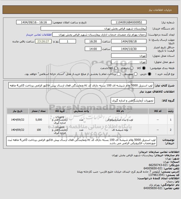 شرح کلی نیاز: لوپ استریل 5000 ولام شیشه ای 100 بسته دارای کد irc ونمایندگی فعال ارسال پیش فاکتور الزامی پرداخت 3الی4 ماهه