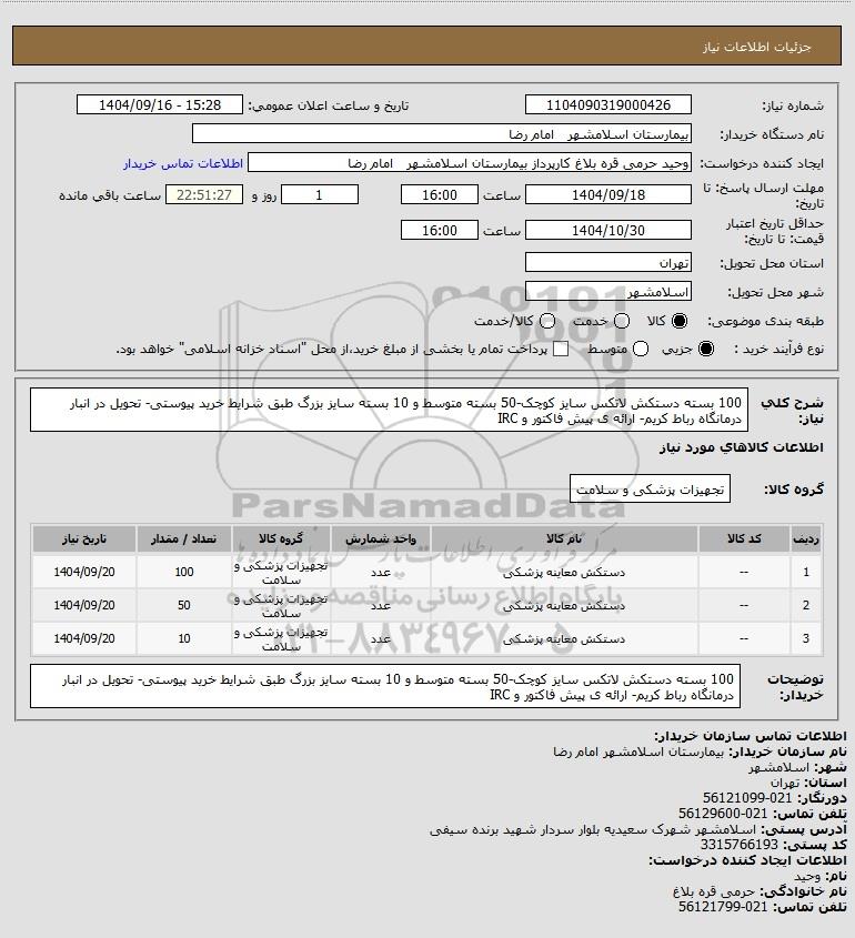| 3 | -- | دستکش معاینه پزشکی | عدد | تجهیزات پزشکی و سلامت | 10 | 1404/09/20 |