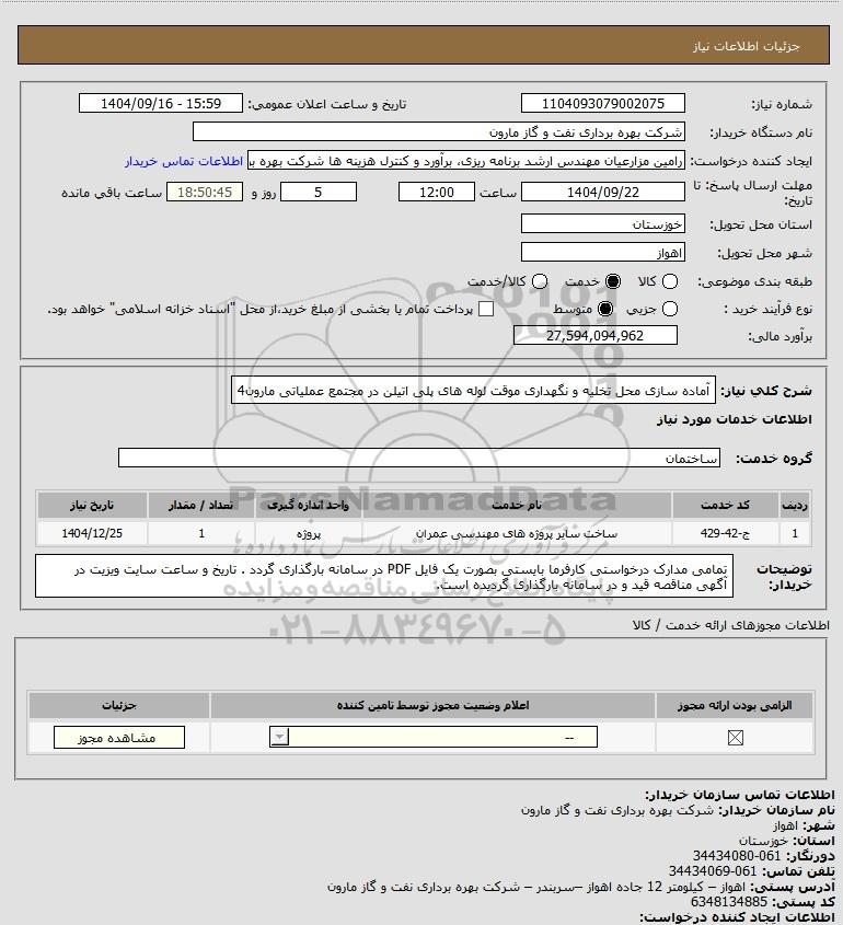 شرح کلی نیاز: آماده سازی محل تخلیه و نگهداری موقت لوله های پلی اتیلن در مجتمع عملیاتی مارون4