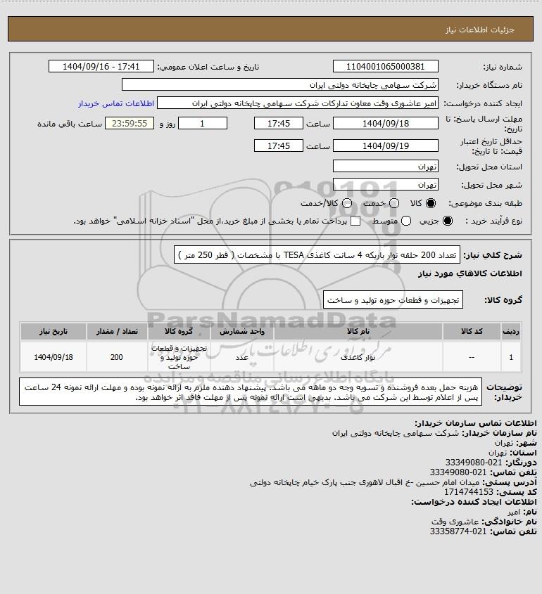 | 1 | -- | نوار کاغذی | عدد | تجهیزات و قطعات حوزه تولید و ساخت | 200 | 1404/09/18 |