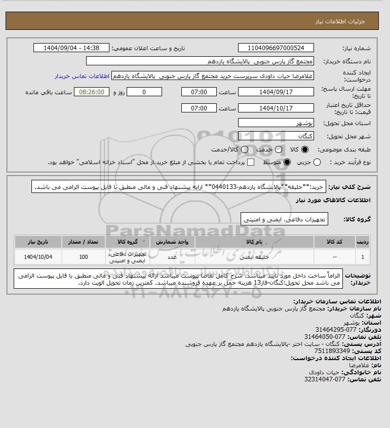 نام دستگاه خریدار:مجتمع گاز پارس جنوبی پالایشگاه یازدهم