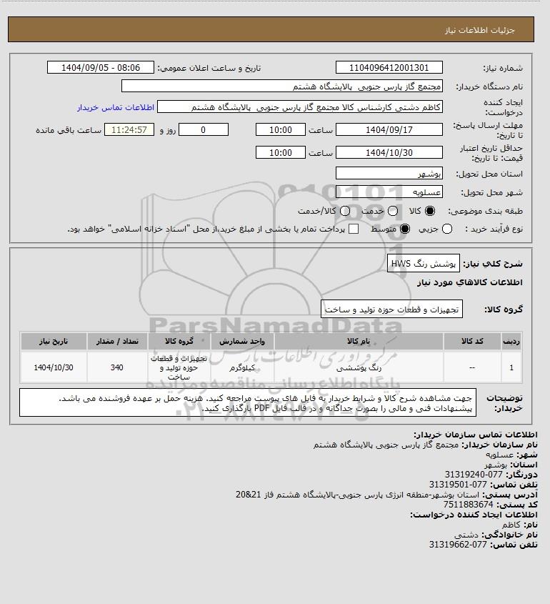 | 1 | -- | رنگ پوششی | کیلوگرم | تجهیزات و قطعات حوزه تولید و ساخت | 340 | 1404/10/30 |