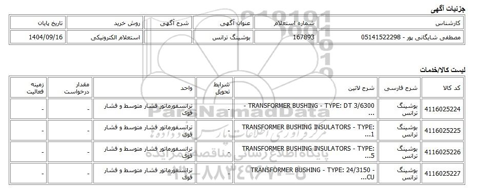 | مصطفی شایگانی پور - 05141522298 | 167893 | بوشینگ ترانس | استعلام الکترونیکی | 1404/09/16 |