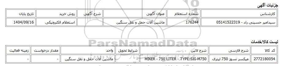 | سیدامیر حسینی راد - 05141522319 | 176244 | ماشین آلات حمل و نقل سنگین | استعلام الکترونیکی | 1404/09/16 |