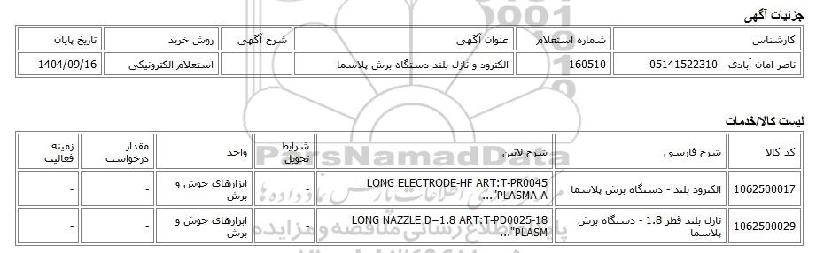 ناصر امان آبادی - 05141522310160510الکترود و نازل بلند دستگاه برش پلاسمااستعلام الکترونیکی1404/09/16