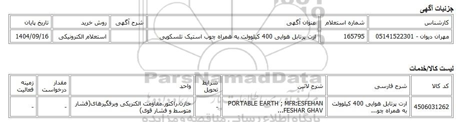 | مهران دیوان - 05141522301 | 165795 | ارت پرتابل هوایی 400 کیلوولت به همراه چوب استیک تلسکوپی | استعلام الکترونیکی | 1404/09/16 |