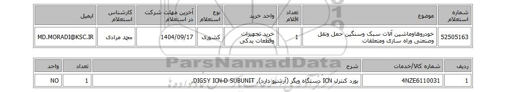 | 52505163 | خودروهاوماشین آلات سبک وسنگین حمل ونقل وصنعتی وراه سازی ومتعلقات | 1 | خرید تجهیزات وقطعات یدکی | کشوری | 1404/09/17 | محمد مرادی | MD.MORADI@KSC.IR |