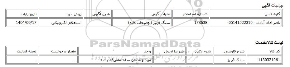 | ناصر امان آبادی - 05141522310 | 173638 | سنگ قرنیز (توضیحات دارد) | استعلام الکترونیکی | 1404/09/17 |