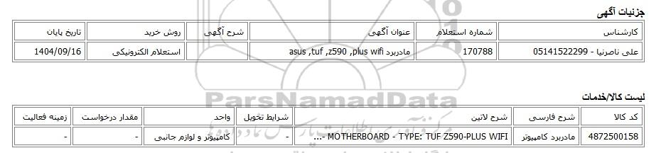| علی ناصرنیا - 05141522299 | 170788 | مادربرد asus ,tuf ,z590 ,plus wifi | استعلام الکترونیکی | 1404/09/16 |
