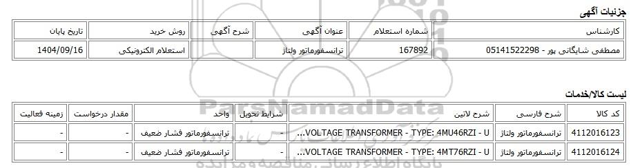 | مصطفی شایگانی پور - 05141522298 | 167892 | ترانسفورماتور ولتاژ | استعلام الکترونیکی | 1404/09/16 |